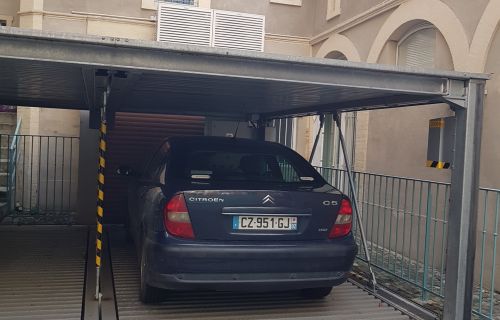 Place de parking fermée, sécurisée, accès cour intérieure par code ou bip puis accès au box par une clé. Une plateforme se souleve pour permettre l'accès direct à la place de parking, puis se rabaisse pour laisser le vehicule dans son emplacement au niveau -1.